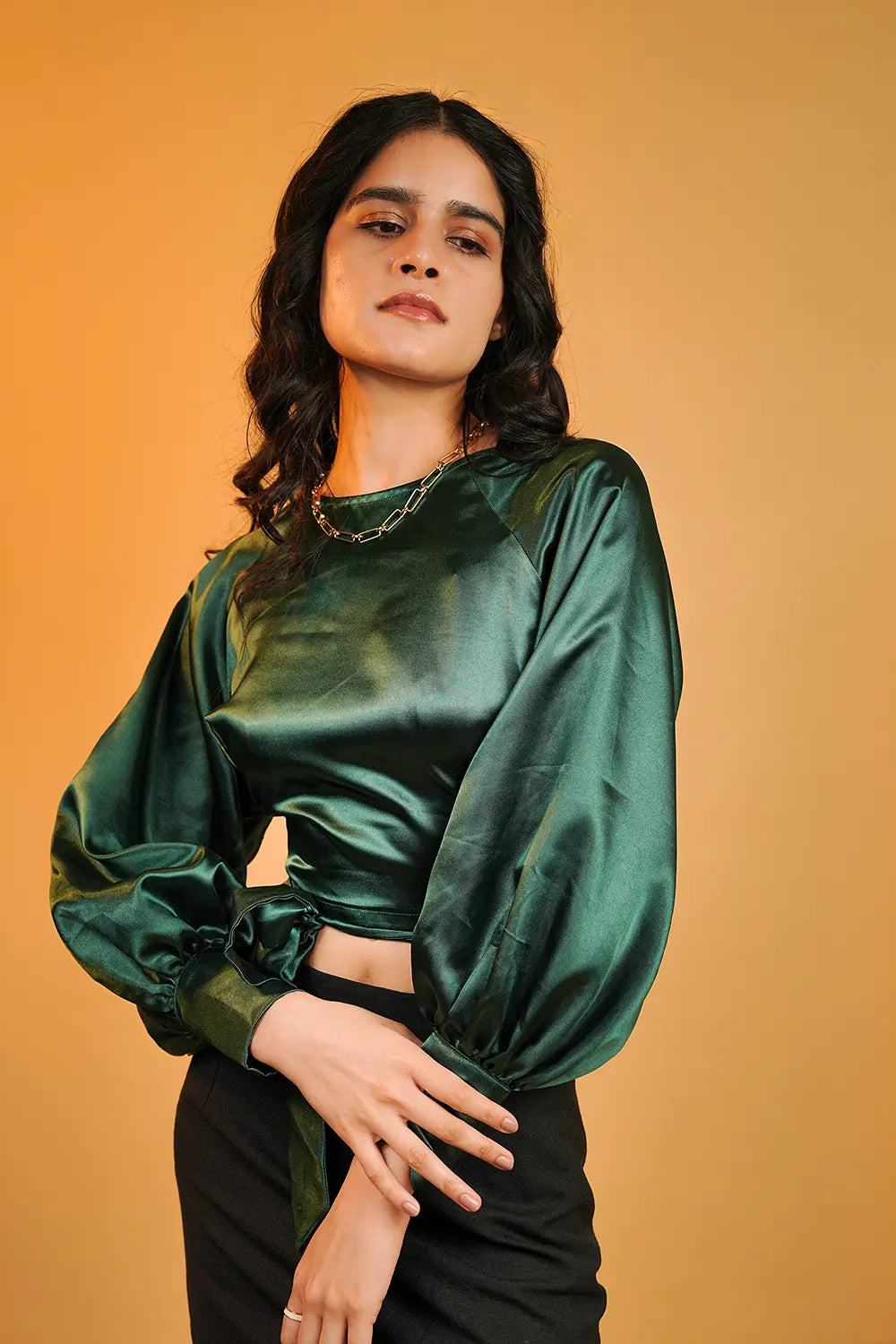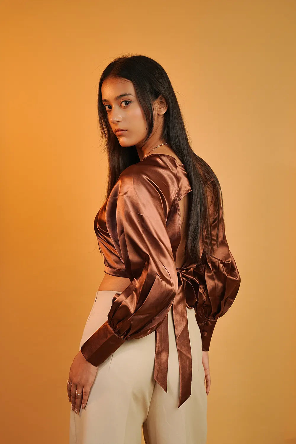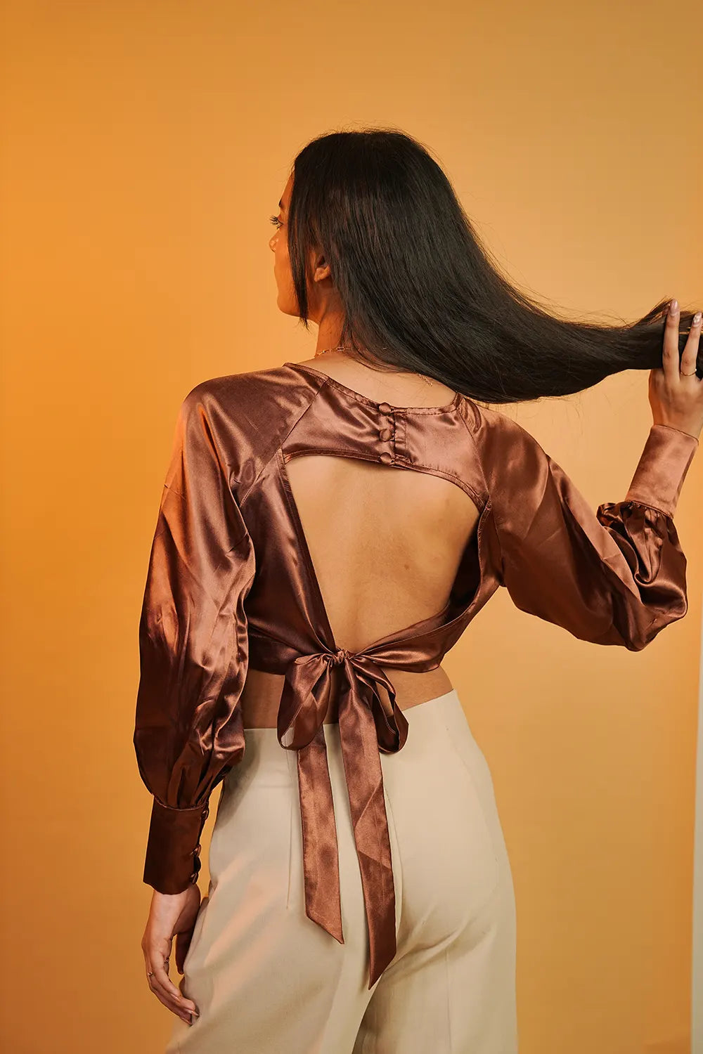 Satin tie-back blouse featuring voluminous balloon sleeves and a statement open back.