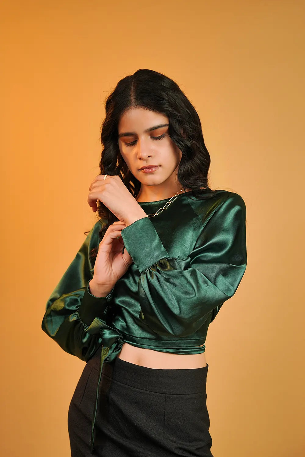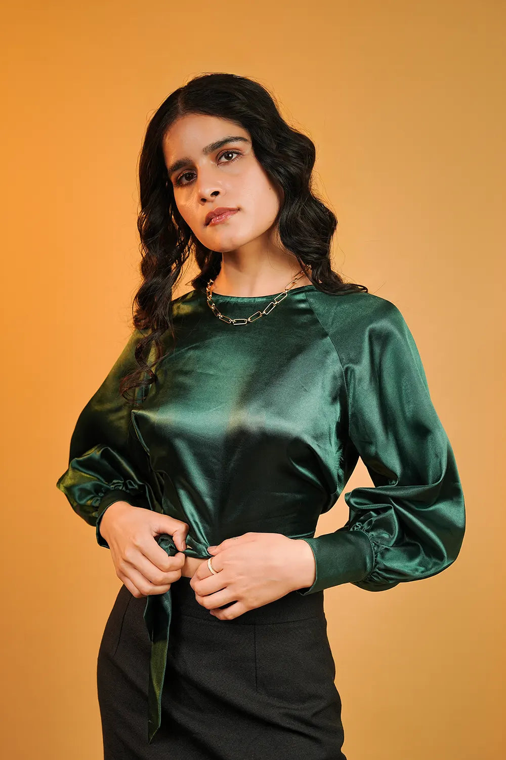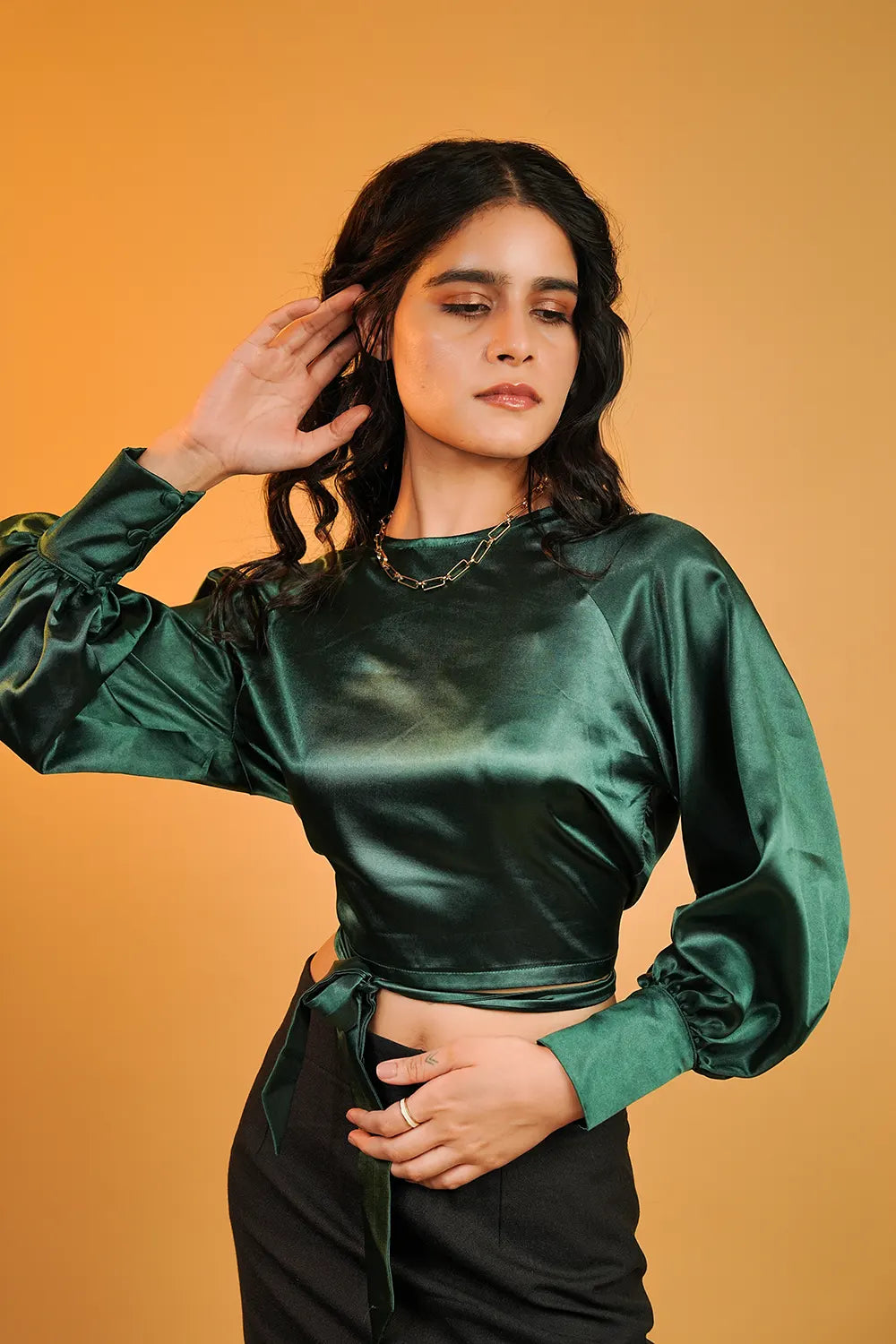 Satin tie-back blouse featuring voluminous balloon sleeves and a statement open back.