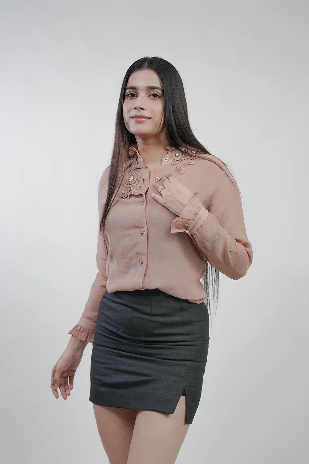 A georgette shirt with delicate floral applique along the neckline and soft flared cuffs.