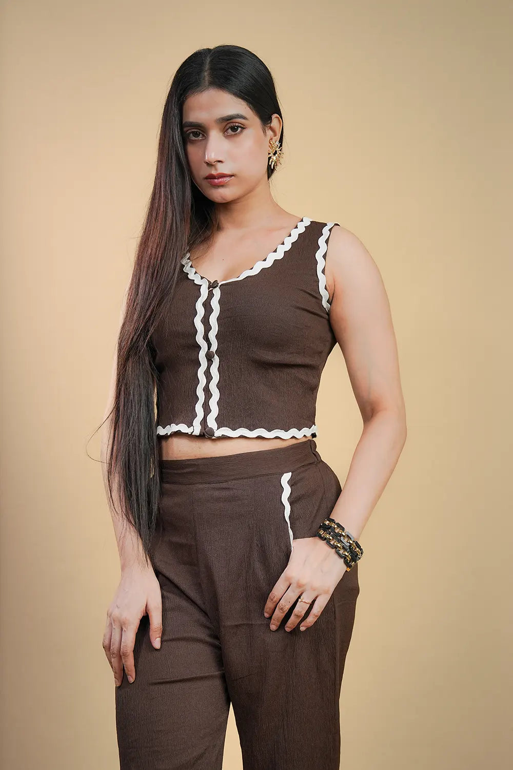 A sleeveless V-neck co-ord set in wrinkle fabric, detailed with lace trims. The chocolate tone and structured silhouette make it equally perfect for brunches.