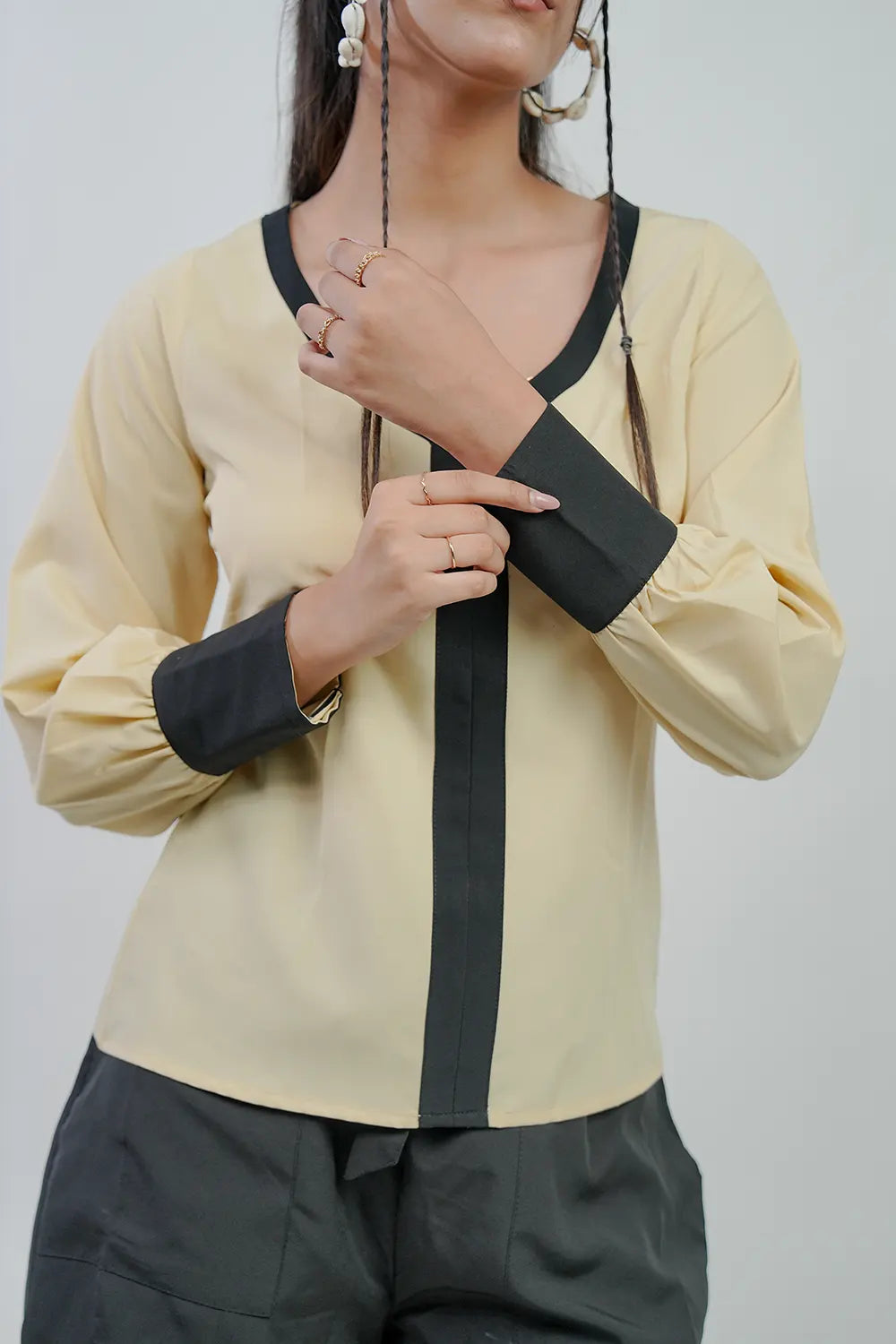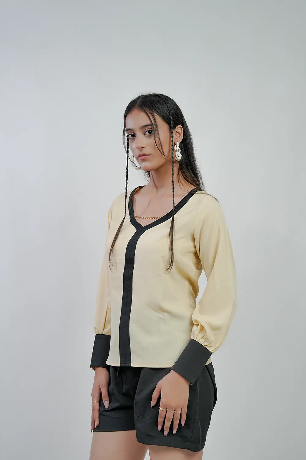 A sleek full-sleeve top designed with a sharp Vneckline and a slight chain detail