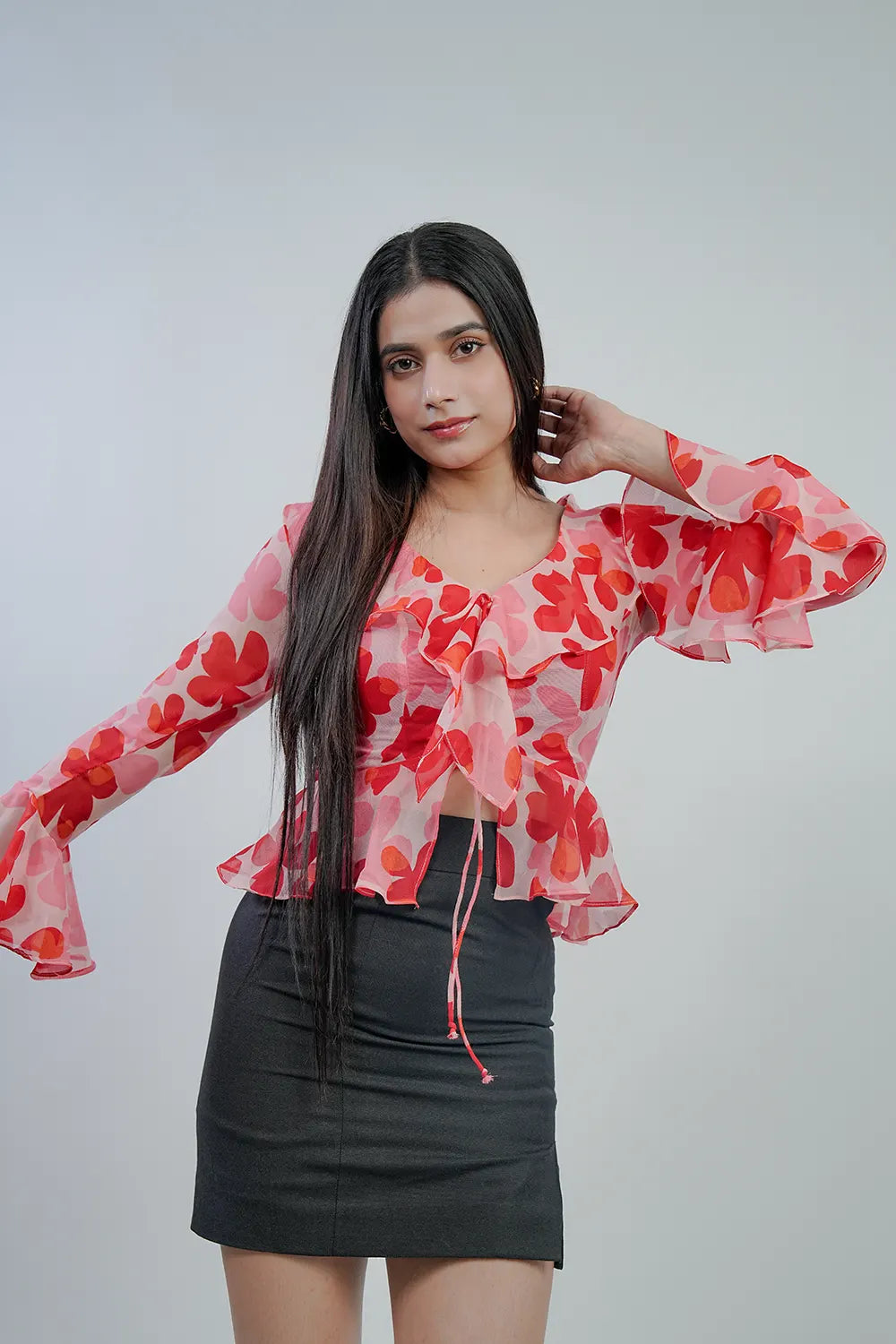 A georgette floral print top with lace-up front and flared sleeves. Light, airy, and perfect for spring-summer styling.