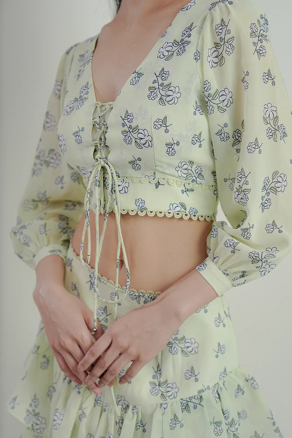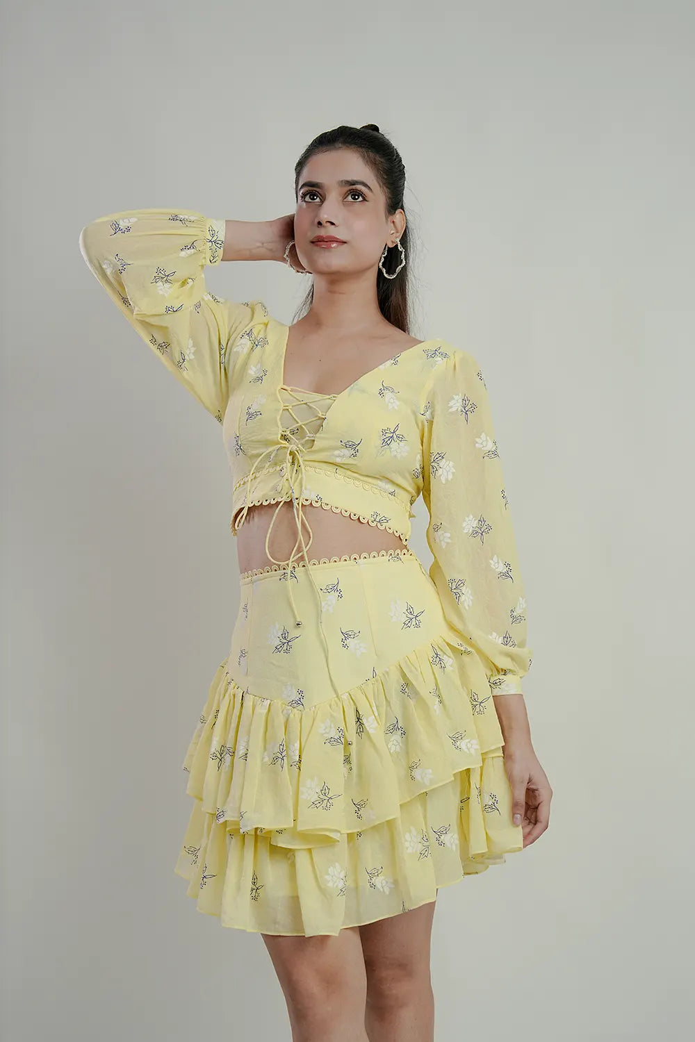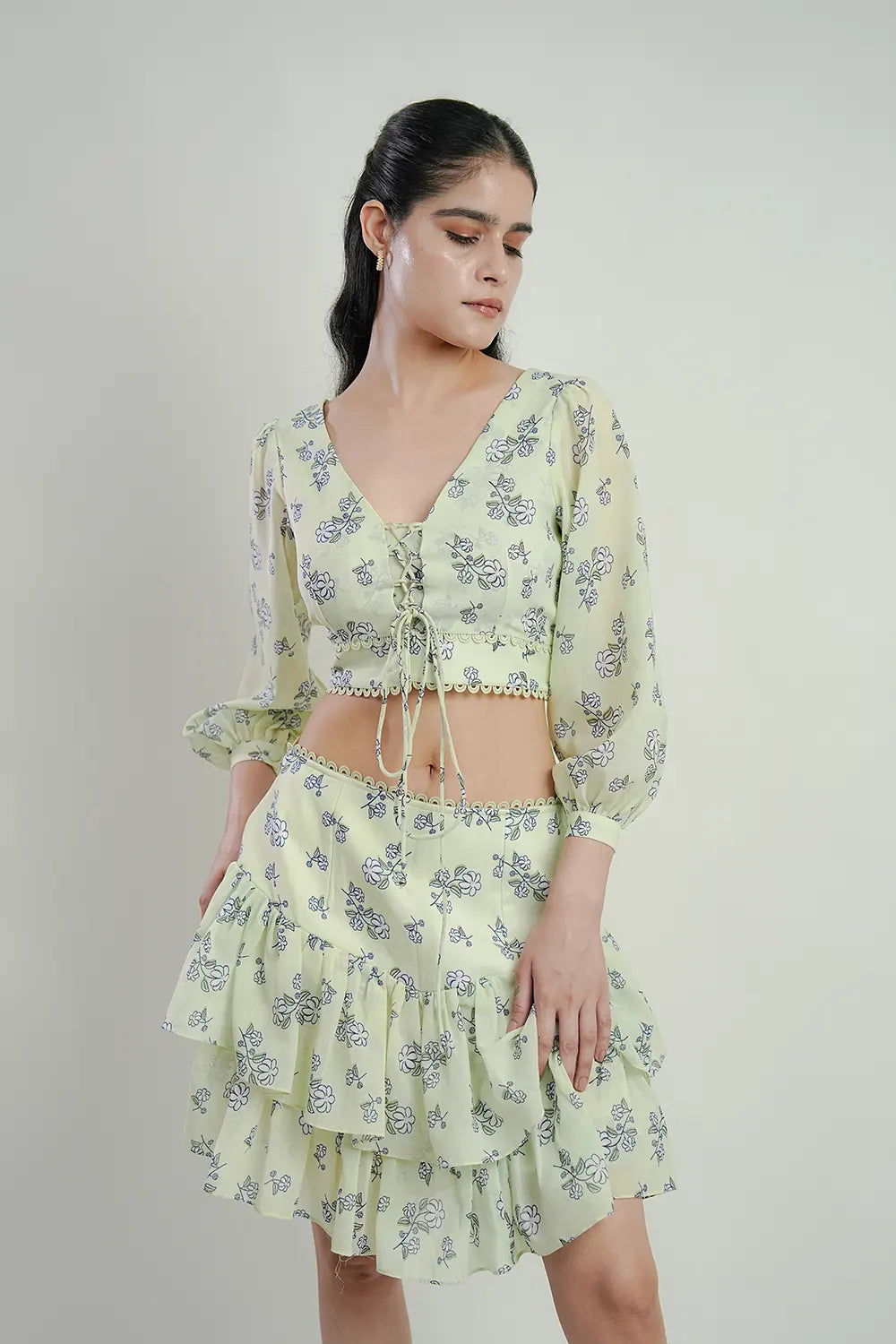 A playful floral co-ord featuring a fitted crop top with a lace-up front and long sleeves, paired with a flared mini skirt with ruffle layers. Designed in lightweight georgette for a breezy summer vibe.