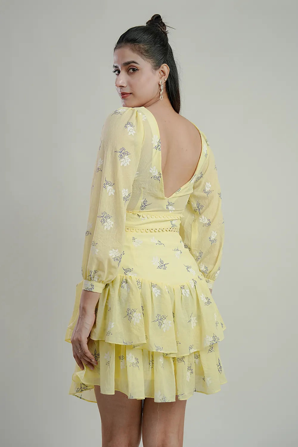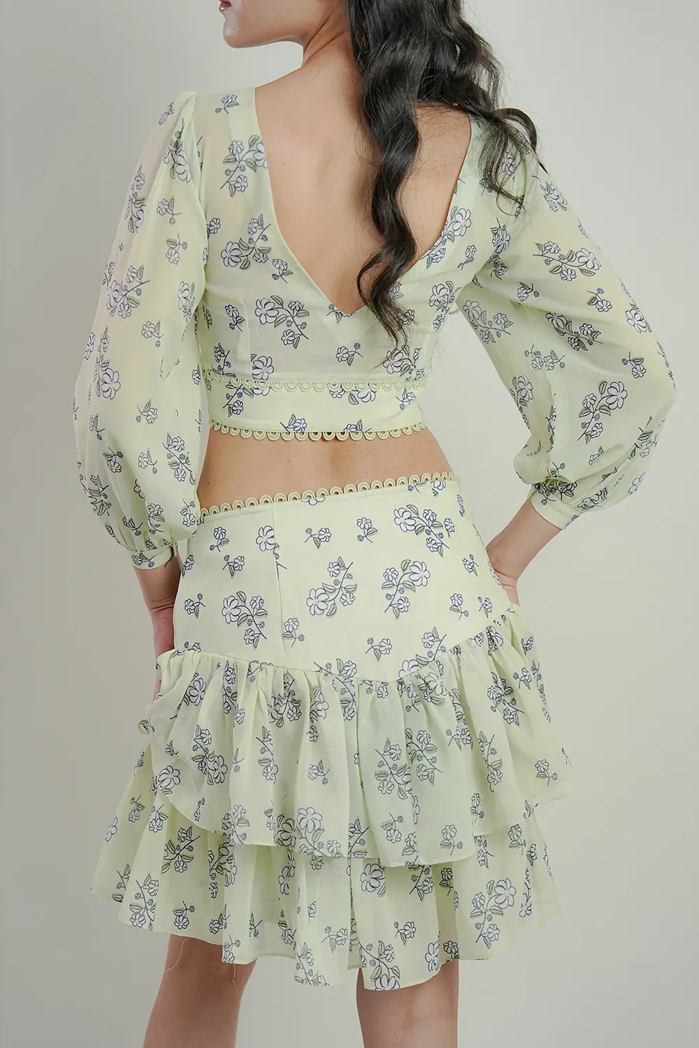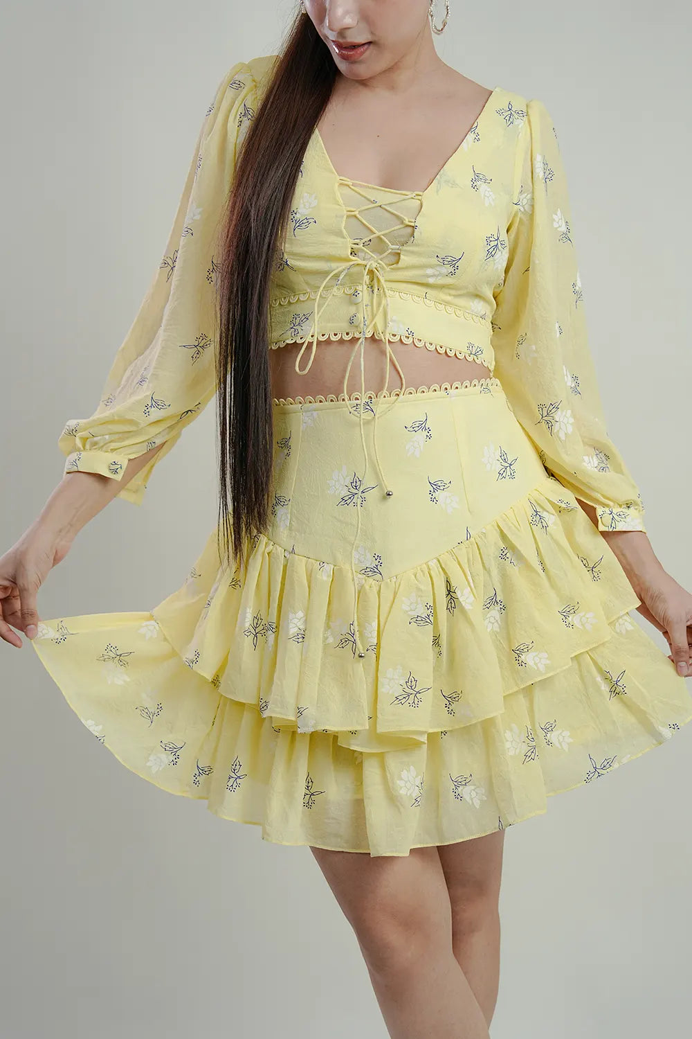 A playful floral co-ord featuring a fitted crop top with a lace-up front and long sleeves, paired with a flared mini skirt with ruffle layers. Designed in lightweight georgette for a breezy summer vibe.