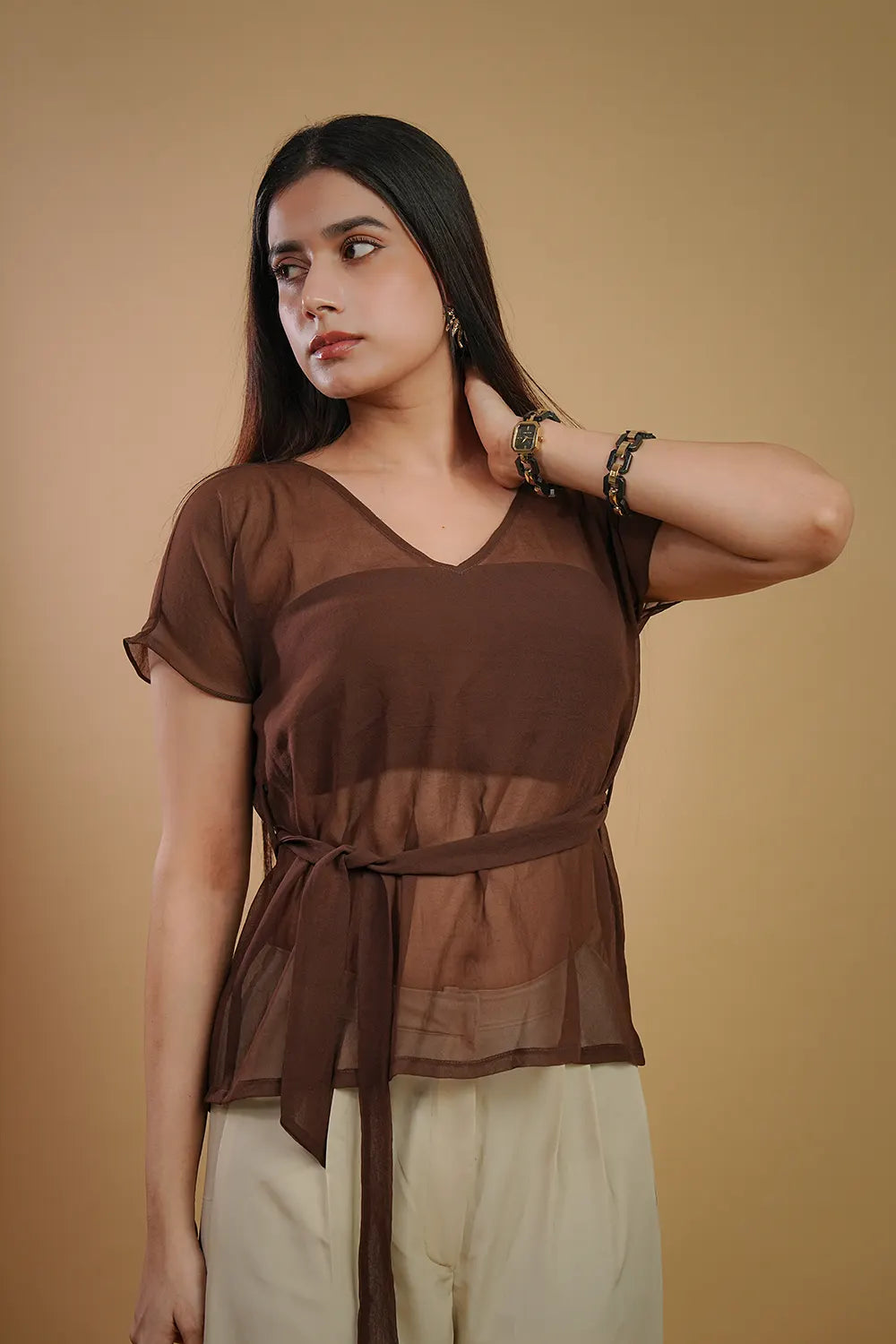 A two-piece co-ord set featuring a sleeveless V-neck top with tie-waist detail and matching wide-leg trousers. Comfortable yet refined, designed for versatile summer styling.
