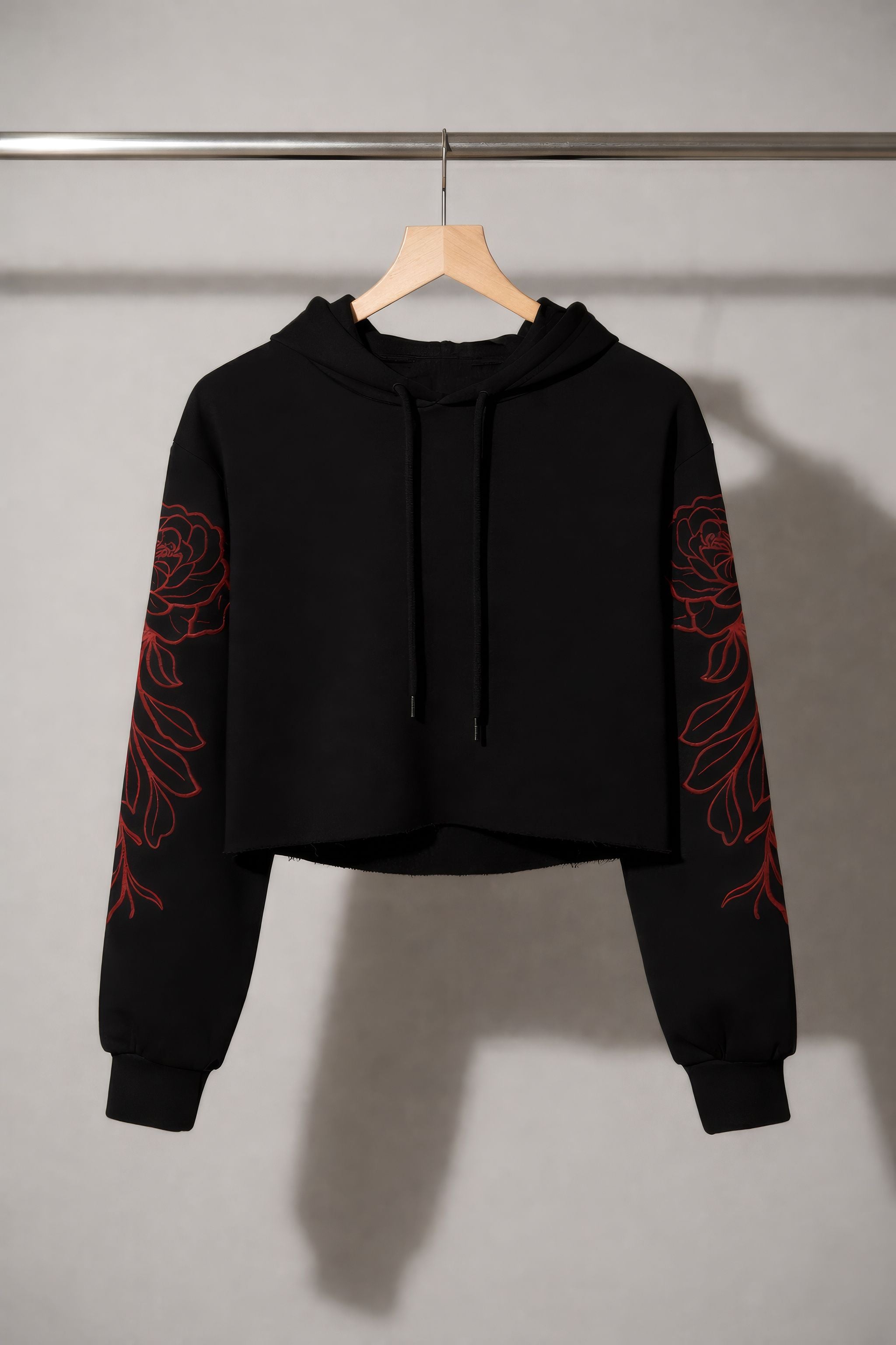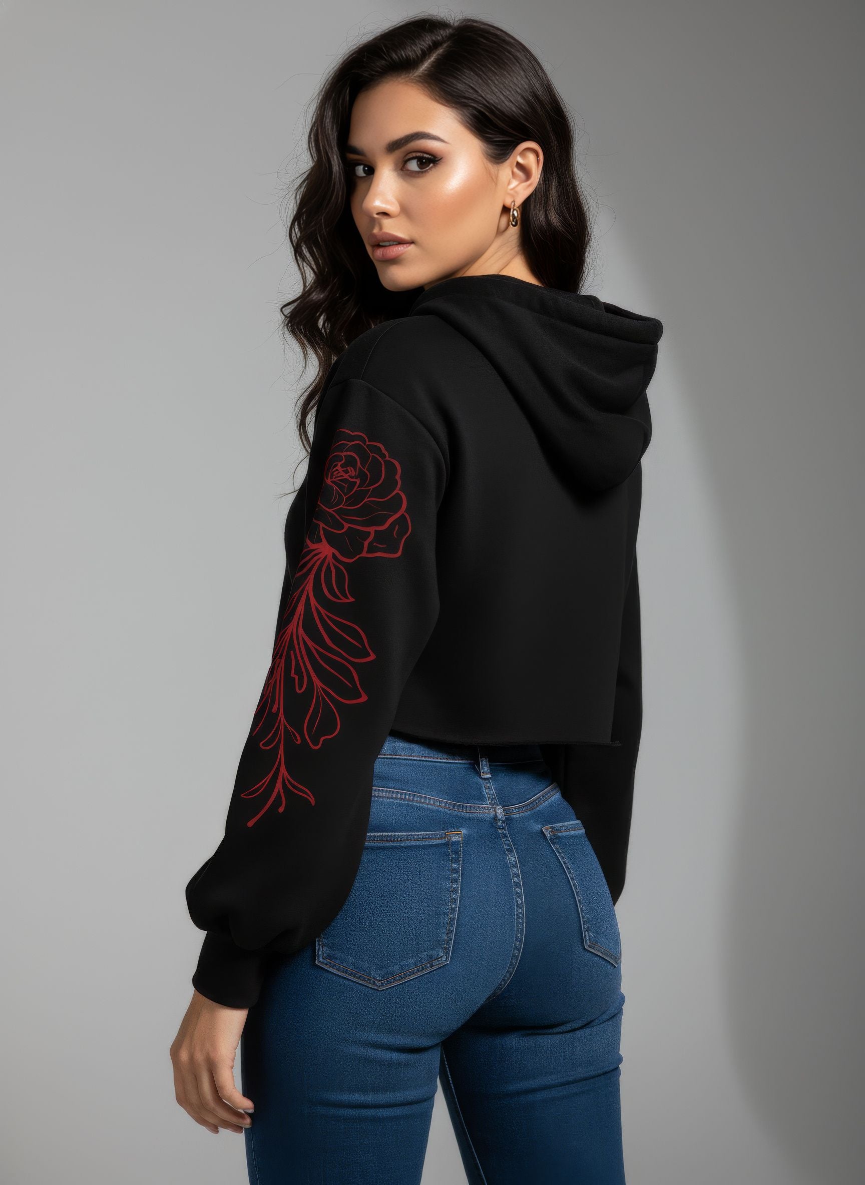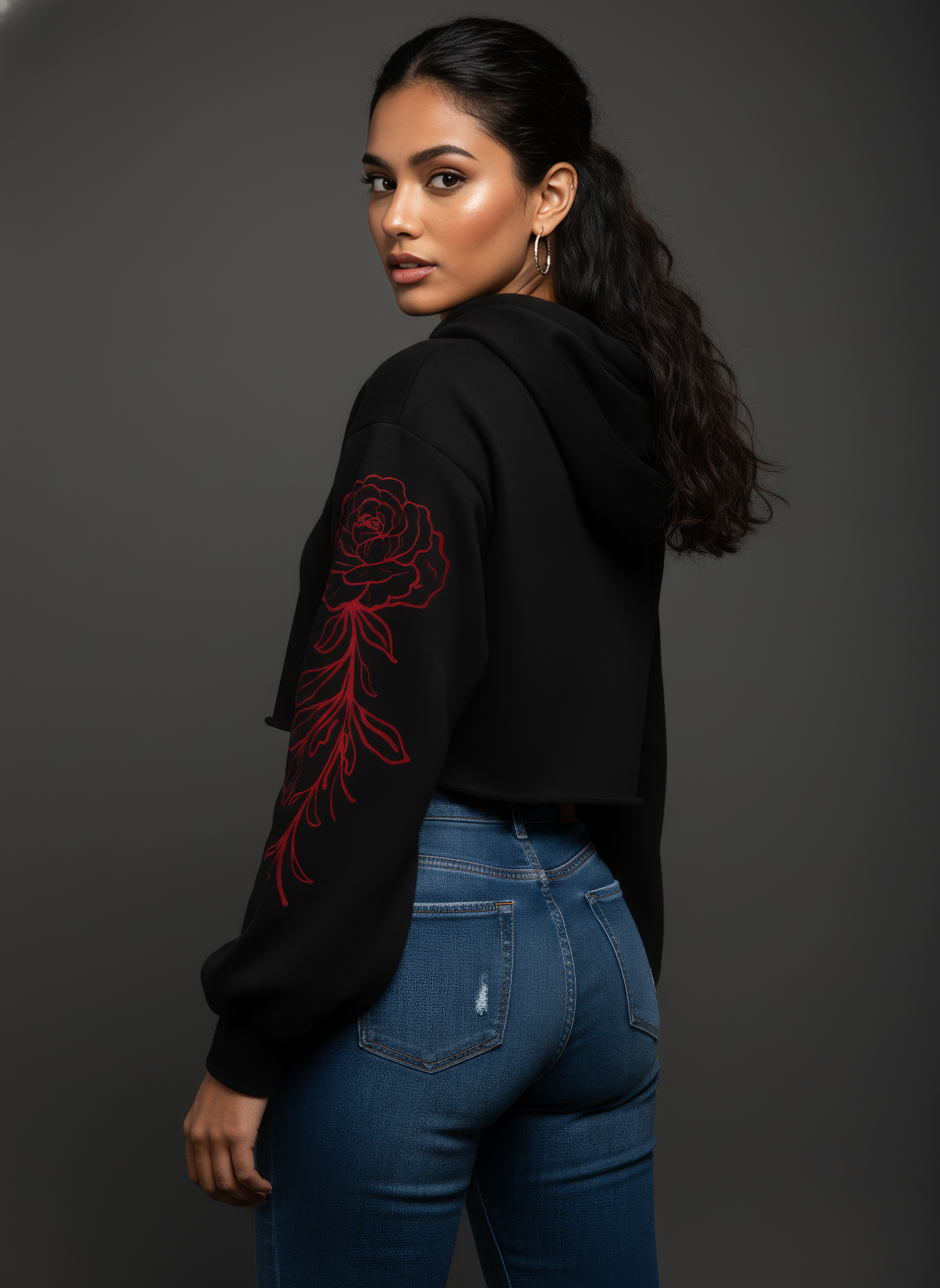 Bold meets beautiful in the Red Rose Crop Hoodie — a perfect blend of elegance and everyday street style. Crafted in a classic black base, this hoodie features a striking red rose graphic cascading down the sleeve, adding a touch of romance and attitude to your look.