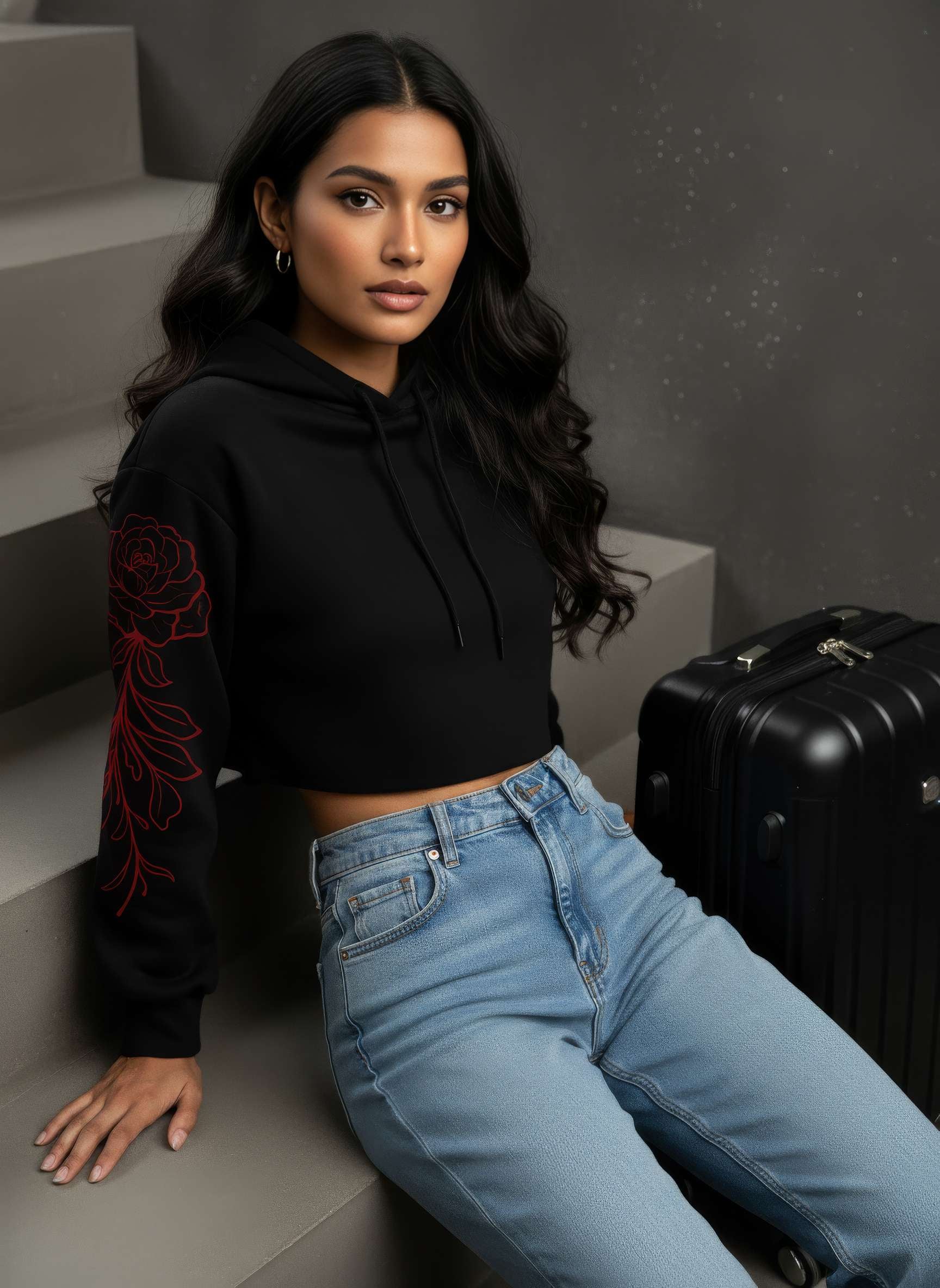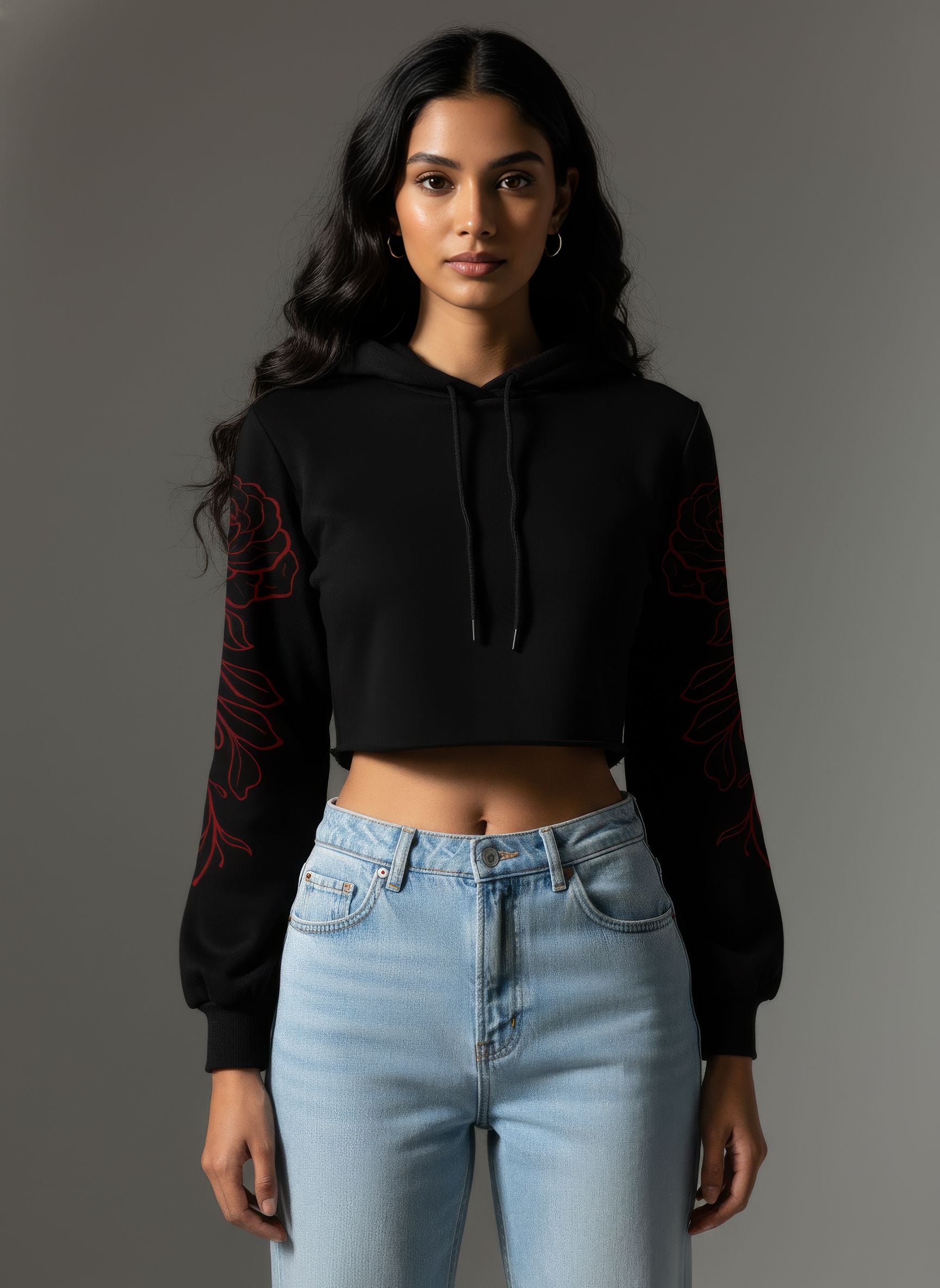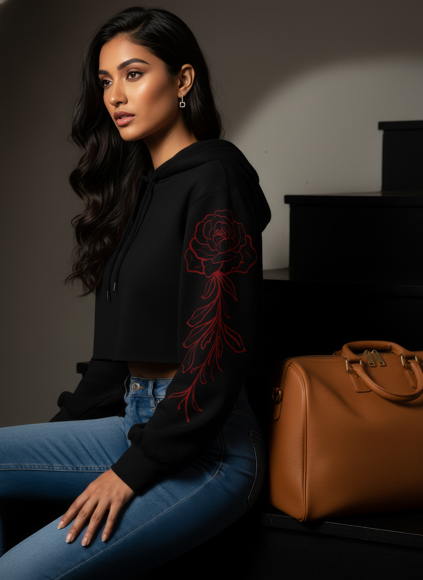 Bold meets beautiful in the Red Rose Crop Hoodie — a perfect blend of elegance and everyday street style. Crafted in a classic black base, this hoodie features a striking red rose graphic cascading down the sleeve, adding a touch of romance and attitude to your look.