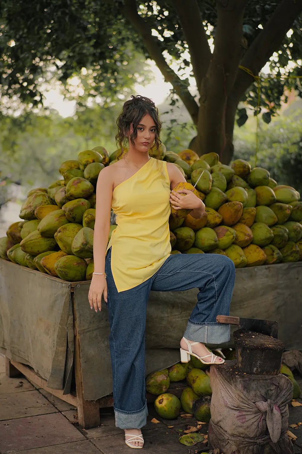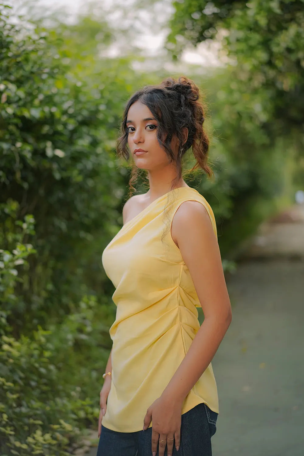 A refined one-shoulder top in delicate lemon-yellow colour, detailed with soft pleats for an elegant yet contemporary look. The airy fabric gives it a fluid drape, making it perfect for both day and evening wear.