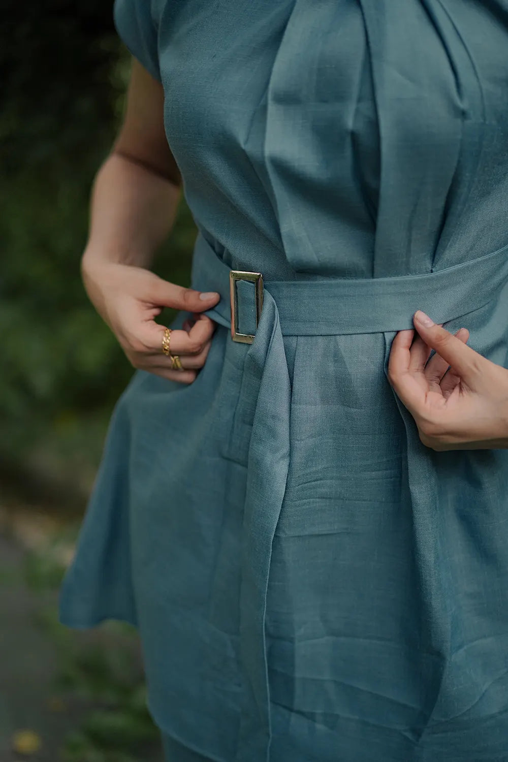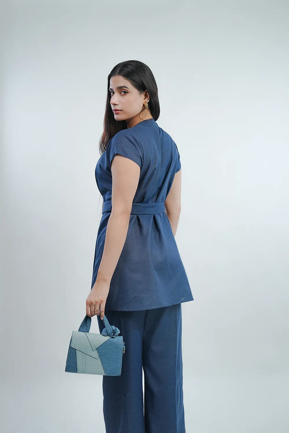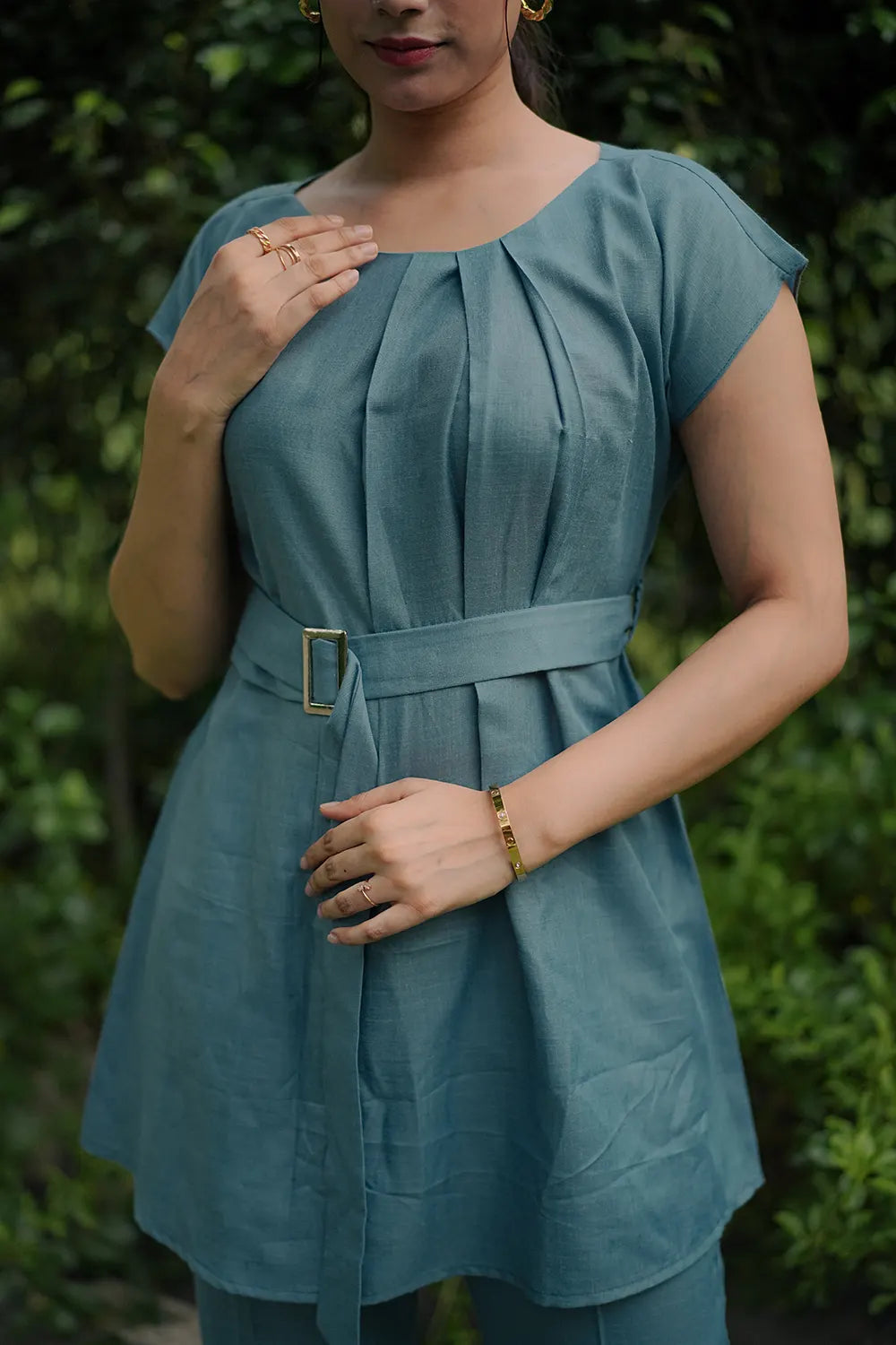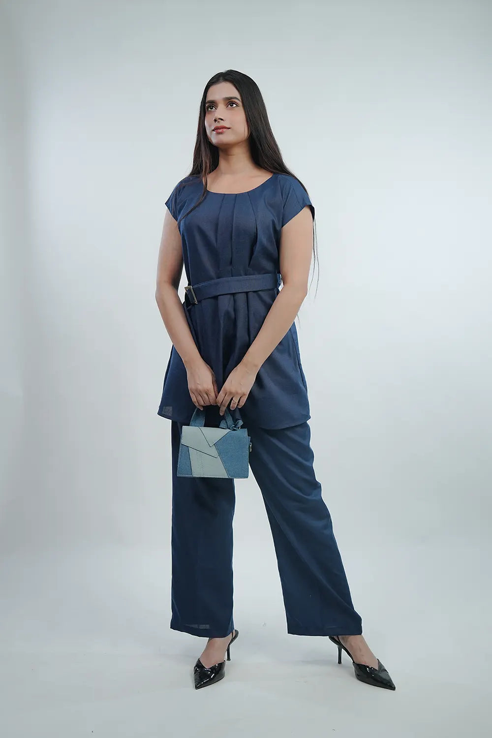 A tailored pleated top paired with straight-fit trousers, crafted in breathable linen. Designed for a sleek and polished silhouette, this co-ord set transitions seamlessly from boardroom chic to evening sophistication.