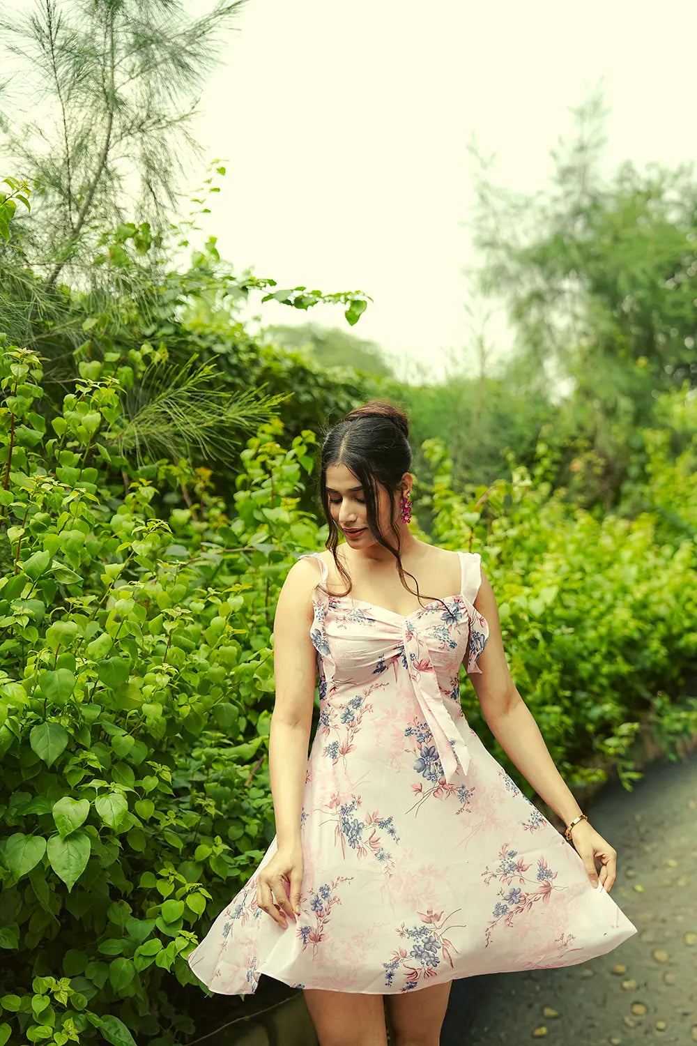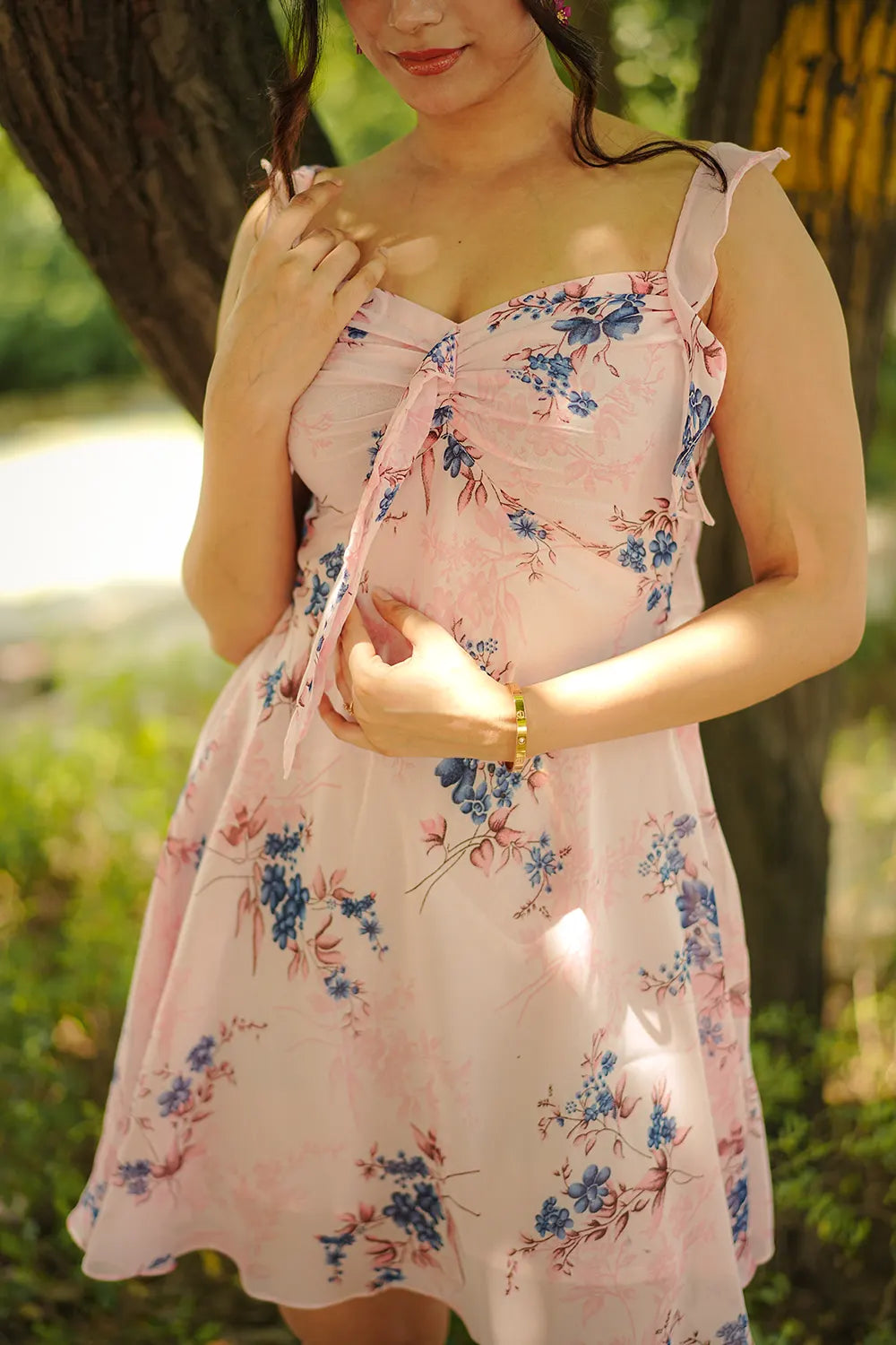 A soft pink georgette sundress with delicate floral motifs and ruffled straps for a romantic summer vibe.