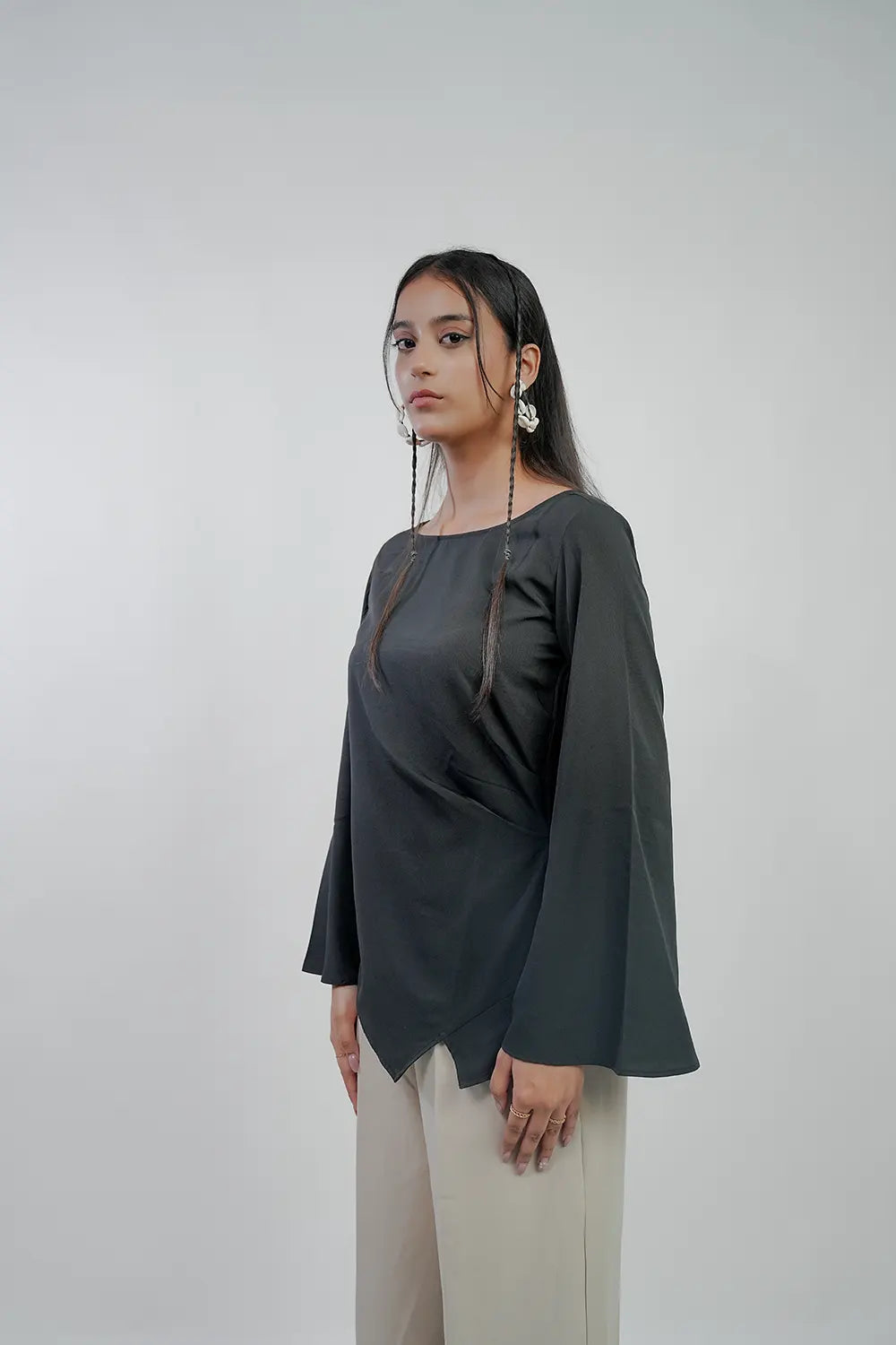 Fit: Relaxed silhouette with flared sleeves and asymmetrical hem