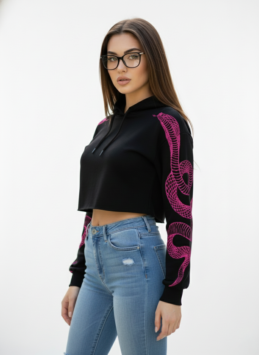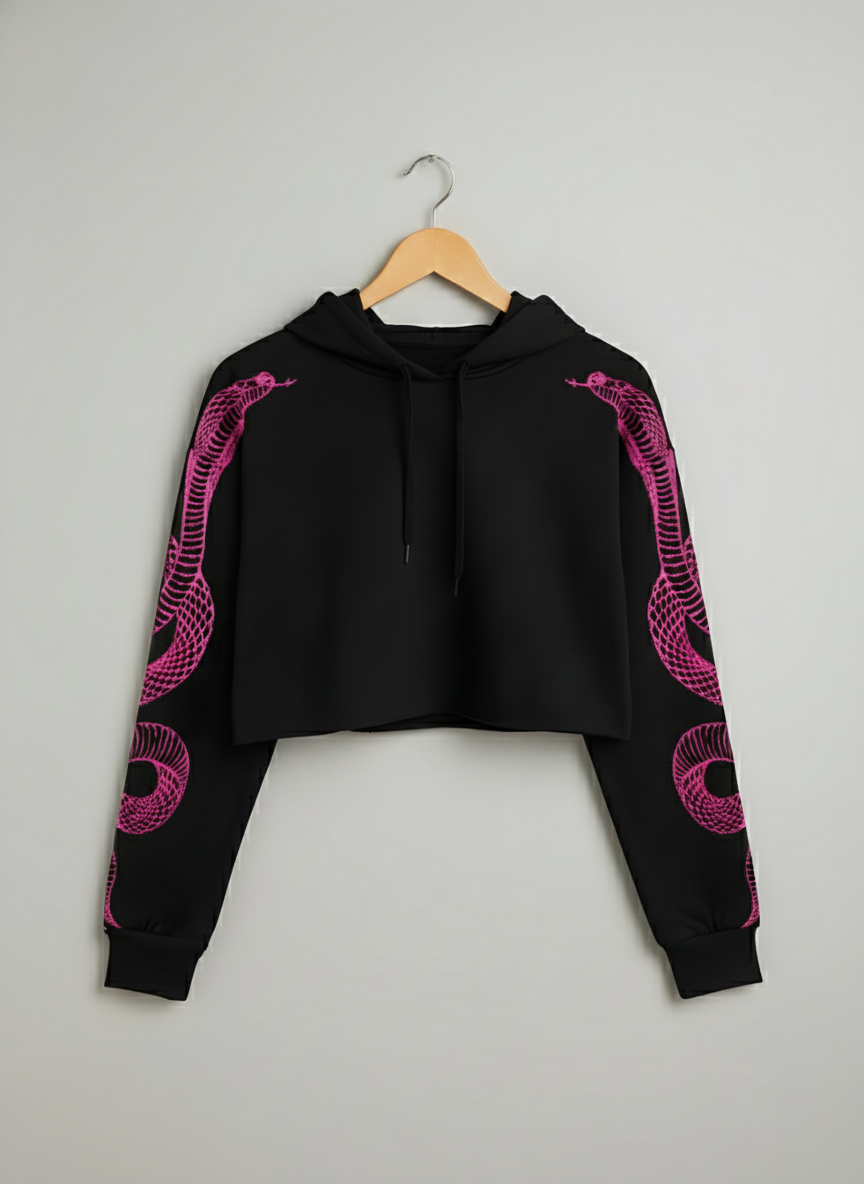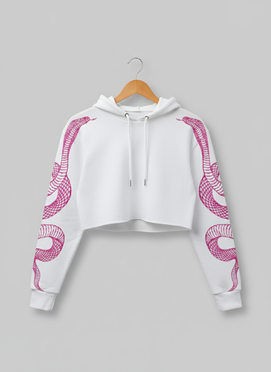 Step into your style era with the Snake Design Crop Hoodie, designed for girls who love adding a touch of boldness to their everyday look—without losing their soft, chic vibe. The elegant pink snake motif on the sleeve brings a playful yet confident charm to this cozy cropped hoodie. The pink snake design adds a stylish pop without feeling too edgy.