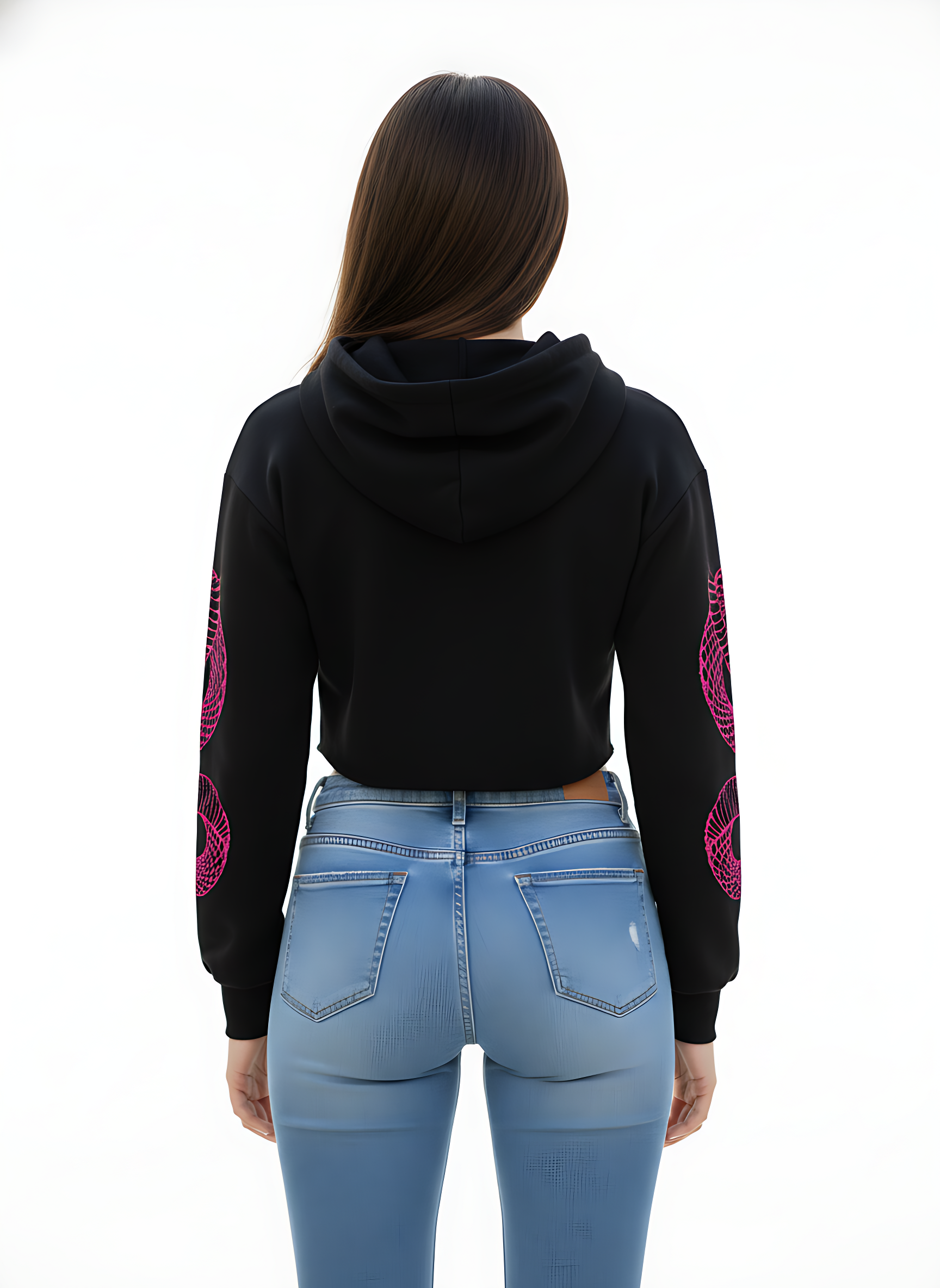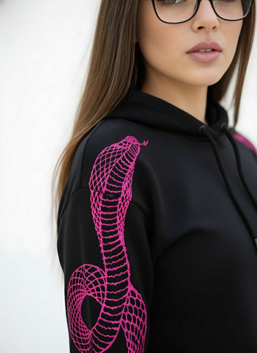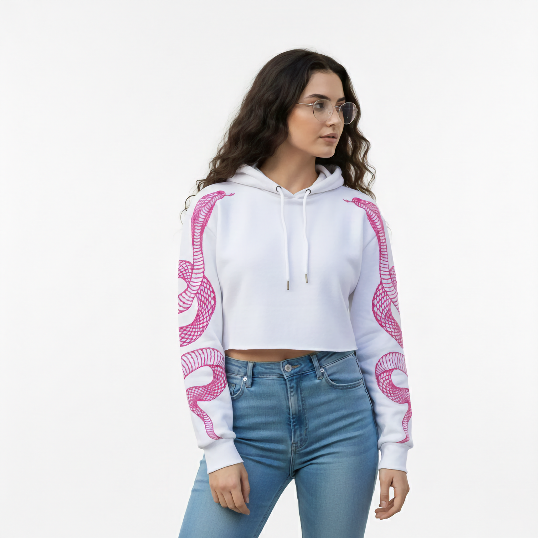 Step into your style era with the Snake Design Crop Hoodie, designed for girls who love adding a touch of boldness to their everyday look—without losing their soft, chic vibe. The elegant pink snake motif on the sleeve brings a playful yet confident charm to this cozy cropped hoodie. The pink snake design adds a stylish pop without feeling too edgy.