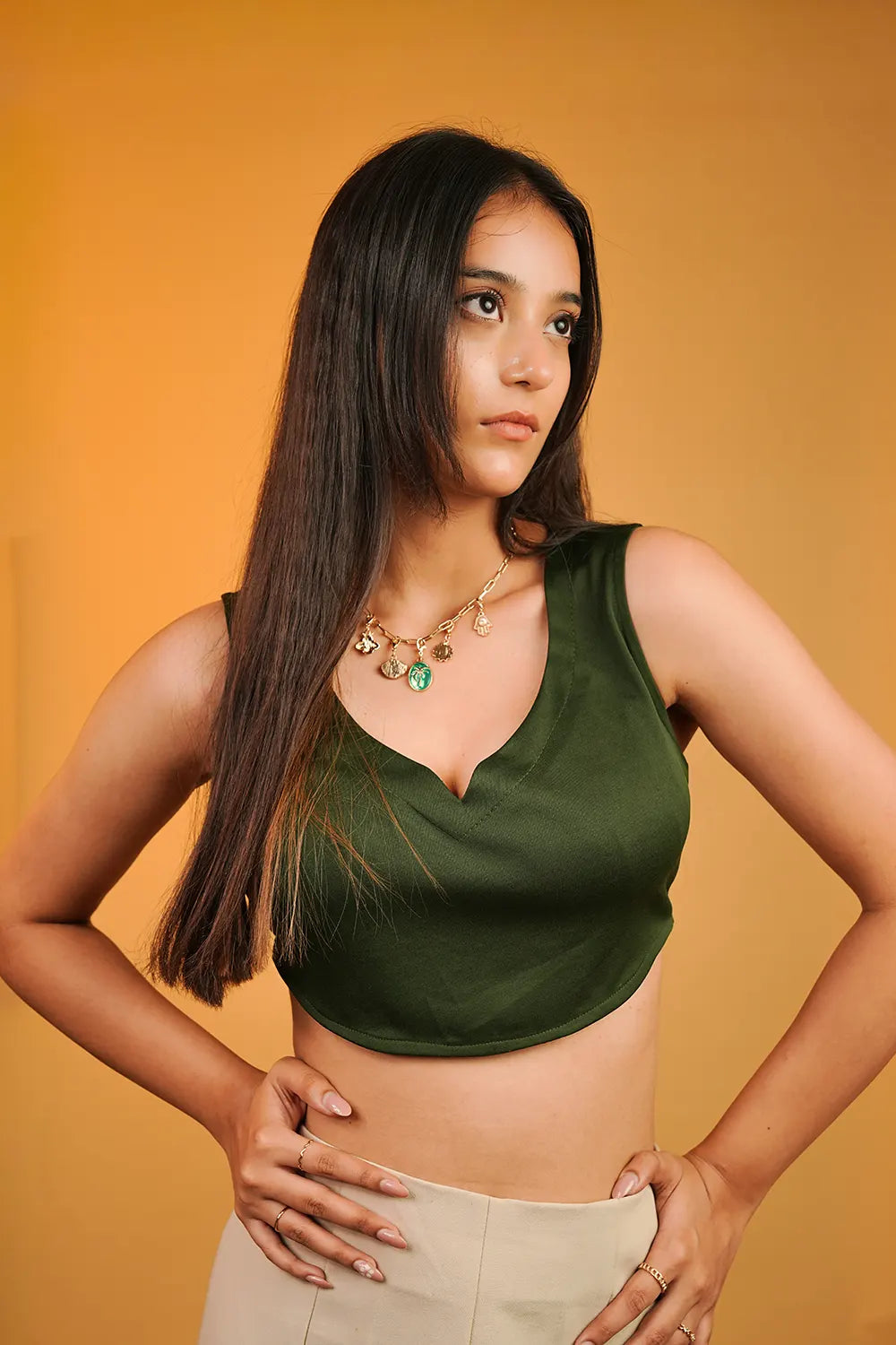 A deep green crop top designed for bold silhouettes, featuring a sharp neckline and twisted back detail. Stretchy lycra ensures comfort with edge.