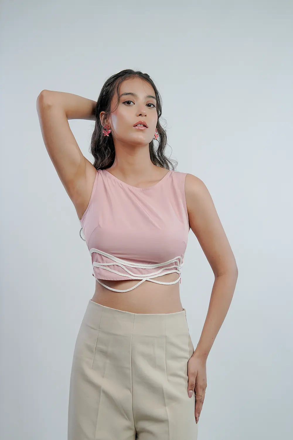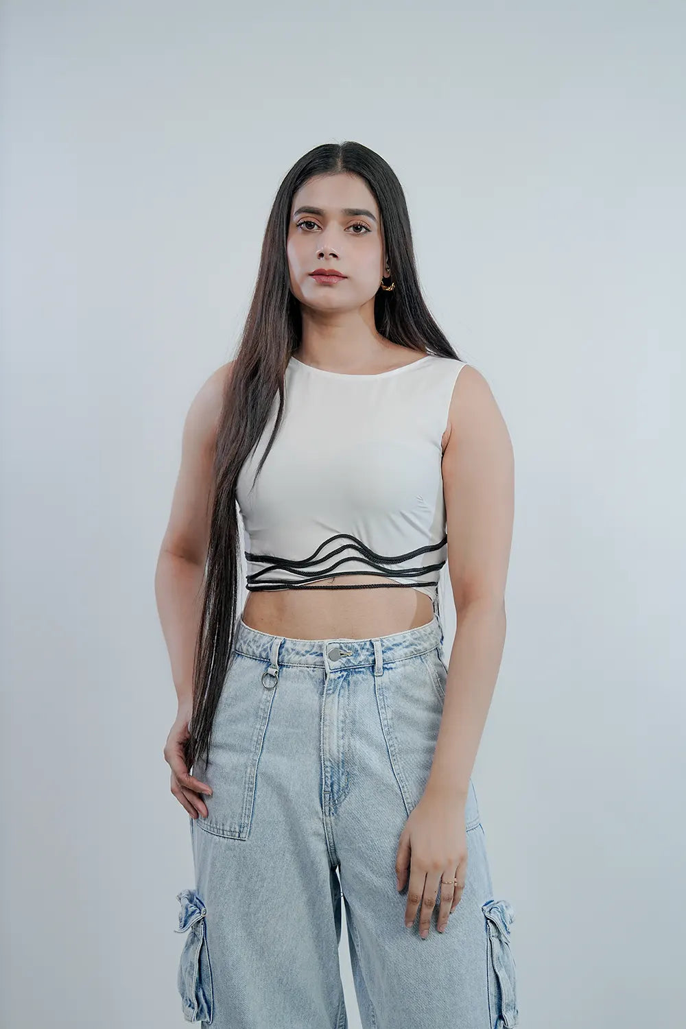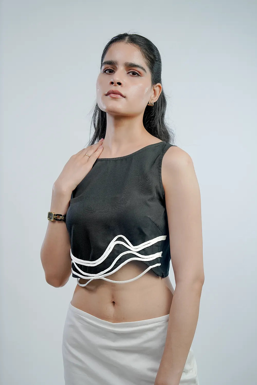 Fit: Cropped length, sleeveless, wavy dori detail.